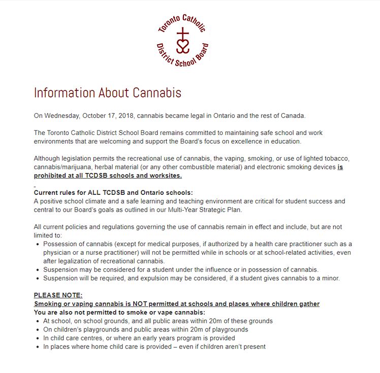 所以TCDSB学校范围内仍然禁止使用大麻,我们一直致力于给学生提供一个安全健康的环境。